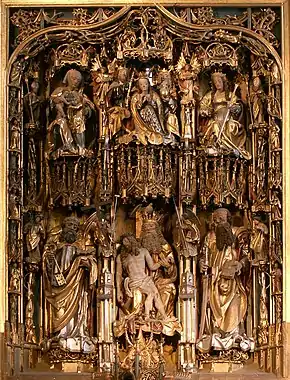 Le retable est de forme inhabituelle pour le XVe siècle. En effet, il est séparé en deux rangées horizontales de sculptures au lieu d'une seule pour la majorité des retables de ce siècle[7]. L'arrière des deux étages peut également être ouvert afin de laisser passer la lumière.