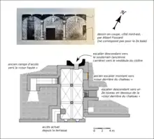 - Albert Fossard fait certainement erreur on y voyant les vestiges d'une simple galerie de circulation. Il mentionne implicitement ces baies : « D'une salle qui, primitivement n'était pas en sous-sol, appelée de nos jours salle capitulaire, on allait à l'église par une galerie encore apparente, quoique effondrée, et montant par des paliers que suivent les décrochements des fenêtres ; les chambranles de celles-ci se voient parfaitement à l'extérieur, dans la partie du mur vers la rivière » (1934, op. cit., p. 75).