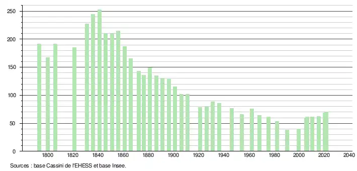 L'évolution du nombre d'habitants est connue à travers les recensements de la population effectués dans la commune depuis 1793. Pour les communes de moins de 10 000 habitants, une enquête de recensement portant sur toute la population est réalisée tous les cinq ans, les populations légales des années intermédiaires étant quant à elles estimées par interpolation ou extrapolation[15]. Pour la commune, le premier recensement exhaustif entrant dans le cadre du nouveau dispositif a été réalisé en 2005[16].