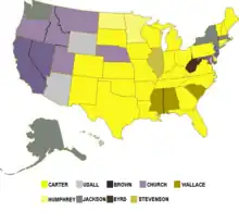 Arrivé deuxième lors du caucus de l'Iowa, il arrive premier lors de la primaire du New Hampshire, un État nordiste. Progressivement, il élimine un par un ses rivaux, parvenant à écraser son principal rival sudiste, l'ex-ségrégationniste George Wallace lors des élections primaires de Caroline du Nord avant de se débarrasser de son rival nordiste le plus sérieux, le sénateur Henry M. Jackson lors des primaires de Pennsylvanie.