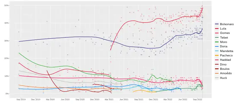L'ancien président Luiz Inácio Lula da Silva (2003-2011), emprisonné pendant deux ans pour des allégations de corruption lors de l'opération Lava Jato par le juge (et candidat) Sergio Moro, n'a pas pu se présenter aux élections de 2018. En 2021, la Cour suprême revient sur son emprisonnement, jugeant la condamnation de Moro « partiale »[27]. Il reste en tête des intentions de vote du fait d'une forte popularité auprès des classes populaires. Son rapprochement avec le centre droit laisse penser que son éventuel retour au pouvoir ne conduira pas à une politique marquée à gauche, bien qu'il se soit prononcé en faveur de hausses d’impôts pour les plus riches[24]. Son programme propose également de relancer un nouveau programme social Bolsa Família : en plus des 600 reais versés par le programme « Auxilio Familia » instauré par Bolsonaro, s'ajouterait le versement de 150 reais pour chaque enfant de moins de six ans dans les familles brésiliennes[23].