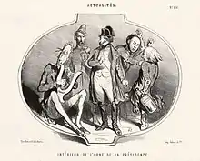 En attendant de pouvoir disposer d'une majorité à l'Assemblée, les partisans de l'Ordre auraient déjà besoin d'un puissant relais à la tête de l'État. Thiers a songé à se porter candidat de ce mouvement avant de se raviser : « Si j'échouais, ce serait un grave échec pour les idées d'ordre ; si je réussissais, je serais obligé d'épouser la République et, en vérité, je suis trop honnête garçon pour épouser une si mauvaise fille ! » L'ancien ministre de Louis-Philippe choisit donc de passer son tour, sans pour autant renoncer à l'idée de se présenter à l'élection présidentielle suivante, prévue pour mai 1852[6]. Lui et les autres membres du comité décident donc de ne pas se mettre en avant pour l'instant et de soutenir un autre candidat. Se méfiant de Cavaignac[alpha 3], homme d'ordre mais républicain intraitable, ils préfèrent se retrancher derrière le populaire candidat bonapartiste, Louis-Napoléon Bonaparte, qu'ils considèrent inconsistant et aisément manipulable.
