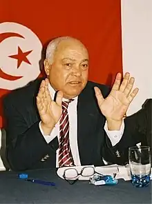 Le 17 septembre, Ahmed Brahim présente également sa candidature, accompagné d'un grand nombre de militants et de cadres du mouvement Ettajdid[86]. Le jour même, au cours d'une conférence de presse, Bouchiha informe que son parti se présente sous la couleur jaune doré et sous le slogan « Ensemble pour édifier la Tunisie du progrès et de la justice »[87]. Le 24 septembre, Mustapha Ben Jaafar est le dernier candidat à présenter sa candidature, en affirmant qu'« il y a des compétences capables d'assumer les plus hautes responsabilités politiques [...] et que l'alternance au pouvoir est possible », sa démarche cherchant à « sortir les Tunisiens de la léthargie et de l'état de démission, dans lesquels ils se trouvent »[88]. Devant ses partisans réunis dans l'enceinte du Conseil constitutionnel, il réclame la libération de syndicalistes condamnés dans la foulée du mouvement social de 2008 dans la région minière de Redeyef.