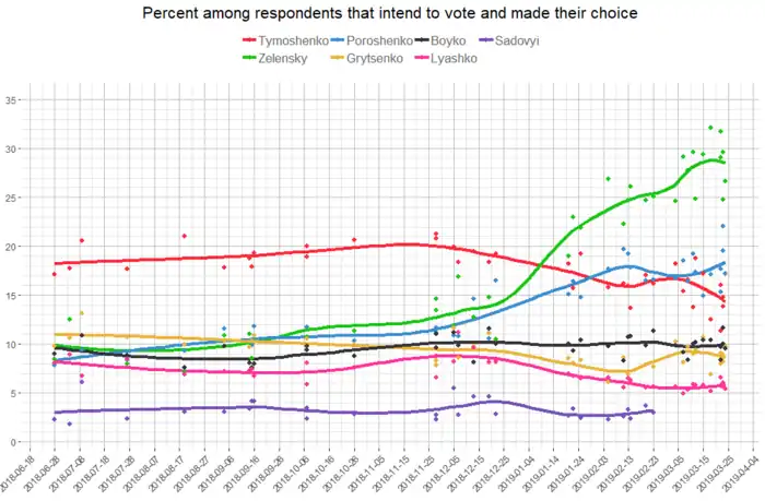 Le scrutin compte 39 candidats en lice, ce qui constitue un record pour une élection présidentielle en Ukraine. L’acteur Volodymyr Zelensky arrive en tête du premier tour, devant le président sortant, Petro Porochenko, candidat à un second mandat. Longtemps donnée favorite, l’ancienne Première ministre Ioulia Tymochenko échoue de peu à se qualifier pour le second tour.