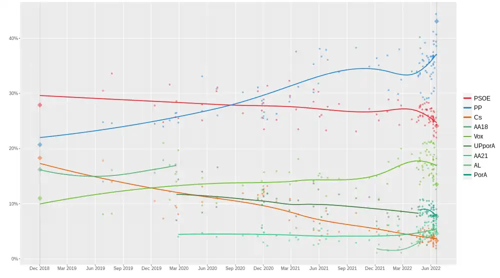 | Institut | Date | PSOE | PP | Cs | UPxA | Vox | AA | AL | PorA |