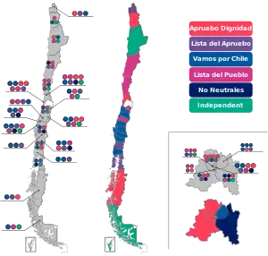 Surtout, les indépendants font une percée surprise. « La liste du peuple » et les « Indépendants non-neutres », seules listes composées d'indépendants à avoir mis en lice des candidats dans toutes les régions du pays, arrivent respectivement en troisième et cinquième position en termes de suffrages, la première dépassant même la « Liste d'approbation » des partis de la gauche historique[26]. Les indépendants totalisent ainsi 48 sièges, soit près de 31 % du total de la constituante, bien davantage que la droite et presque autant que l’ensemble des partis de gauche[27]. Ces indépendants sont pour la plupart directement issus du mouvement de contestation, et ont fait campagne pour les réformes les plus profondes du système économique chilien[23]. Leur percée est directement perçue comme une défiance de l'électorat à l'encontre des partis traditionnels, déconsidérés par la population[24].