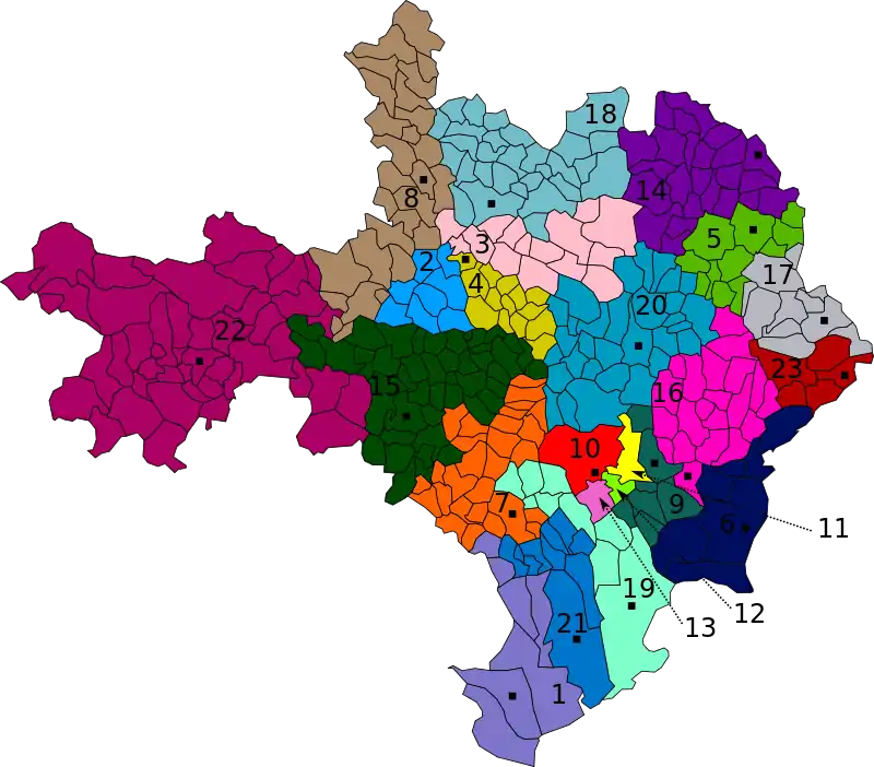 1- Aigues-Mortes, 2- Alès-1, 3- Alès-2, 4- Alès-3, 5- Bagnols-sur-Cèze, 6- Beaucaire, 7- Calvisson, 8- La Grand-Combe, 9- Marguerittes, 10- Nîmes-1, 11- Nîmes-2, 12- Nîmes-3, 13- Nîmes-4, 14- Pont-Saint-Esprit, 15- Quissac, 16- Redessan, 17- Roquemaure, 18- Rousson, 19- Saint-Gilles, 20- Uzès, 21- Vauvert, 22- Le Vigan, 23- Villeneuve-lès-Avignon