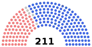 | Total sièges | 6 | 5 | 92 | 65 | 16 | 21 | 6 | 211 | ||