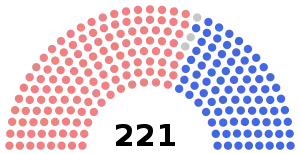 | 221 sièges de la Chambre des communes (Majorité absolue : 111 sièges) | ||||||||||||||