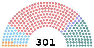 | Total sièges : | 34 | 26 | 14 | 14 | 103 | 75 | 10 | 11 | 4 | 7 | 1 | 1 | 1 | 301 | ||
