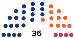 La Chambre des sénateurs est quant à elle dotée de 36 sièges pourvus au scrutin proportionnel plurinominal dans neuf circonscriptions correspondant aux départements du pays, à raison de 4 sièges par département. La répartition se fait selon la même méthode qu'à la chambre basse[58].