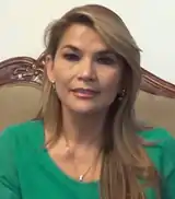 Le , Áñez annonce la convocation prochaine d'une nouvelle élection présidentielle, de façon qu'un nouveau président prenne ses fonctions d'ici le , comme prévu[27]. La séance parlementaire destinée à fixer la date de la présidentielle a lieu le [28]. La séance étant suspendue pour cause de quorum non atteint par le boycott des parlementaires du Mouvement vers le socialisme (MAS), conformément à la constitution plurinationale, elle se déclare chargée de l'intérim de la présidence de l'État, arguant de la nécessité de ne pas laisser le pays sans gouvernement et de celle de pacifier le pays[29]. Evo Morales dénonce alors « le coup d'État le plus astucieux et le plus odieux de l'histoire a eu lieu »[30]. Le Tribunal constitutionnel plurinational valide l'accession de Jeanine Áñez à la présidence de l'État par intérim dans un communiqué publié le [31].