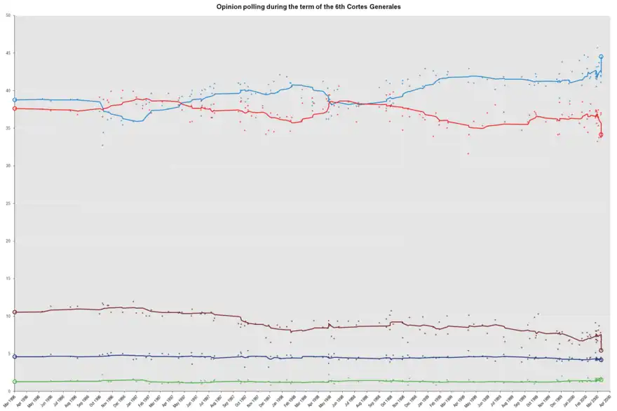 Lors des élections générales anticipées du 3 mars 1996, le Parti populaire (PP) de José María Aznar remporte la majorité relative au Congrès des députés avec 156 députés sur 300. Au pouvoir depuis 1982, le Parti socialiste ouvrier espagnol (PSOE) du président du gouvernement Felipe González obtient 141 sièges et cède la place de première force politique espagnole pour la première fois en 13 ans. Aznar obtient ainsi le plus faible résultat pour un vainqueur depuis 1977. Aucun parti ne détenant la majorité absolue des 176 mandats, le rôle des nationalistes catalans de Convergence et Union (CiU), qui obtiennent 16 parlementaires, se révèle déterminant[1].
