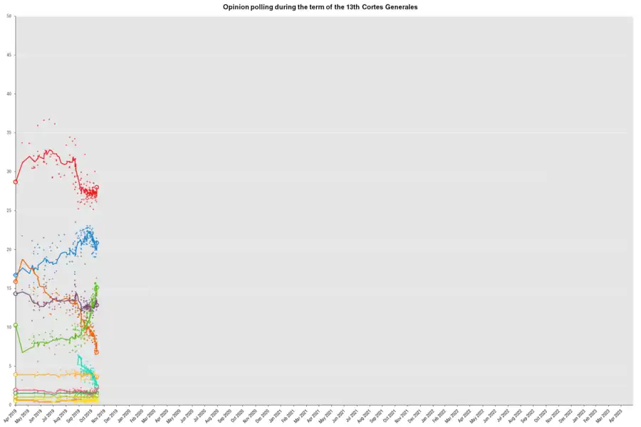Le graphique ci-dessous est une synthèse des résultats des sondages réalisés depuis les élections du 28 avril 2019. La largeur du graphique correspond à la durée du mandat de quatre ans qu'aurait dû connaitre la législature issue de ces élections. La publication de sondages électoraux est interdite en Espagne à partir du jusqu'au scrutin.