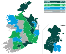 Le scrutin voit la victoire surprise du Sinn Féin, le parti décrochant la première place en termes de suffrages. Ce bon résultat est paradoxalement amputé en termes de sièges par le nombre peu élevé de candidats du parti, fruit d'une stratégie électorale prise bien avant les sondages favorables de fin de campagne. Anticipant de faibles résultats après ceux décevant obtenus de manière répétée lors des européennes et des municipales de l’année précédente, le Sinn Féin ne présente en effet que 42 candidats pour 160 sièges à pourvoir afin d'éviter que les voix supposées peu nombreuses de ses électeurs ne se dispersent sur un trop grand nombre de candidatures lors de ces législatives[15]. En comparaison, le Fianna Fáil et le Fine Gael présentent respectivement 84 et 82 candidats.