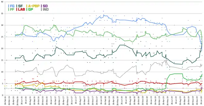 Les deux principaux instituts de sondages irlandais, Red C et Behaviour and Attitudes (B&A), associés respectivement au The Sunday Times et au The Sunday Business Post, utilisent des méthodologies distinctes qui conduisent à des résultats nettement différents même lorsque organisés aux mêmes dates. Le graphique ci-dessous les représente sous la forme d'une courbe moyennée.