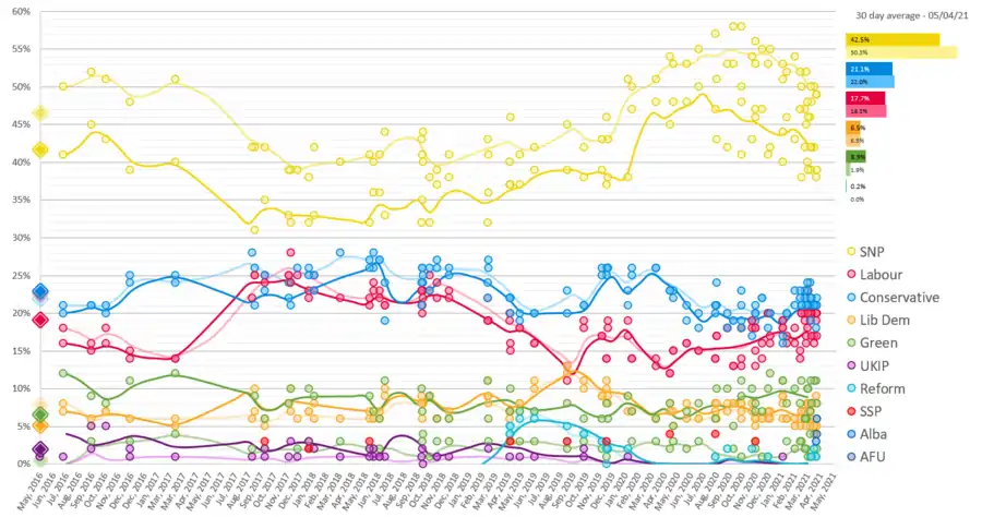 La période de campagne est aussi précédée d'une déclaration du Premier ministre britannique Boris Johnson qui a qualifié au mois de novembre la dévolution des pouvoirs de « désastre »[6], à contre-courant de l'opinion publique écossaise qui avait voté en faveur de celle-ci à 75 % en 1997, et l'approuve en 2019 à plus de 90 %[7].