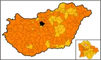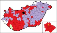 ![]() Élections législatives hongroises de 2010, premier tour: candidat en première position: ██ = majorité absolue Fidesz-MPSZ-KDNP(119) ██ = majorité relative Fidesz-MPSZ-KDNP (56) ██ = majorité relative MSZP (1) |