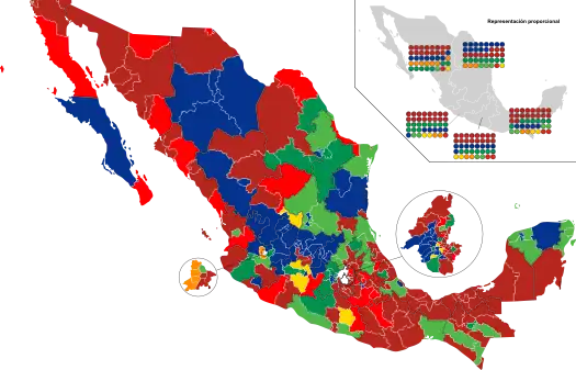 | Parti révolutionnaire institutionnel (PRI) | 2 715 123 | 5,75 | 11 | 8 715 899 | 18,35 | 40 | 70 | |||||||
