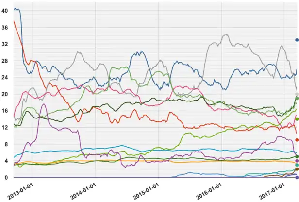 | Ipsos[5] | 18,8 % | 20,1 % | 14,4 % | 10,9 % | 9,0 % | 11,0 % | 3,7 % | 1,6 % | 2,5 % | 2,4 % | 4,8 % | ||