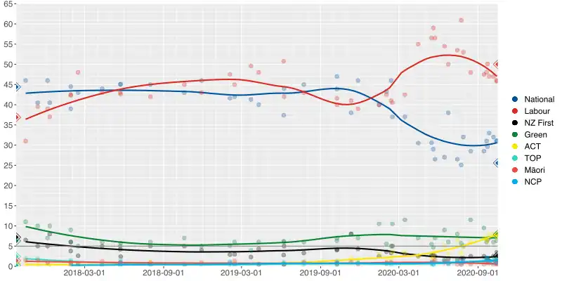 Après avoir culminé à plus de 55 % au cours de l'été, le parti travailliste redescend à 50 % d'intentions de vote dans les sondages, ce qui pourrait permettre à Jacinda Ardern de décrocher la majorité absolue des sièges. Le système électoral de représentation proportionnel mixte qui favorise les petites formations pourrait toutefois forcer le Parti travailliste à recomposer avec l'un de ses deux alliés actuel, les Verts et Nouvelle-Zélande d'abord. Le Parti national de Judith Collins n'est pour sa part crédité que de 23 % des intentions de vote[17].