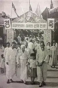 Le gouvernement nord-coréen a affirmé que 78 % des électeurs éligibles en Corée du Sud ont participé à l'élection de 1 080 délégués du peuple[2]. Les délégués du peuple sud-coréen se sont ensuite réunis du au à Haeju, avec la participation de 1 002 des 1 080 élus. Ils ont élu 360 députés à l'Assemblée populaire suprême sur la base d'un député pour 50 000 Sud-Coréens[2].