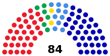 Répatition des sièges à l'issue des élections. L'ARENA est en bleu foncé, le FMLN en rouge, le PCN en bleu clair, le PDC en vert et le Cambio Democrático en jaune.