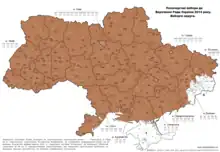 De même, à la suite de la guerre du Donbass, neuf circonscriptions de l'oblast de Donetsk sur 21 et dans six circonscriptions de l'oblast de Louhansk sur onze, les élections ne se dérouleront pas. Ce sont les circonscriptions no 41, 42, 43 et 44 (à Donetsk même), 51 (Horlivka), 54 (Chakhtarsk), 55 et 56 (Makiïvka) et 61 (Starobecheve) dans l'oblast de Donetsk ; no 104 et 105 (à Louhansk même), 108 (Khroustalny), 109 (Sorokyne), 110 (Altchevsk) et 111 (Dovjansk) dans l'oblast de Louhansk. En conséquence, les élections ne se dérouleront pas dans 27 des 225 circonscriptions et seuls 198 députés seront élus dans le reste des circonscriptions, ce qui donnera un total de 423 députés élus (sur les 450).