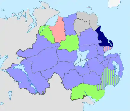 Le , le Local Government (Boundaries) Act (Northern Ireland) (en)[1], une loi du Parlement d’Irlande-du-Nord, institue 26 zones de gouvernement local qui sont définis précisément dans le Local Government (Boundaries) Order (Northern Ireland) du [2]. Est alors abrogé le système hérité du Local Government (Ireland) Act (en) du introduit par le Parlement du Royaume-Uni.