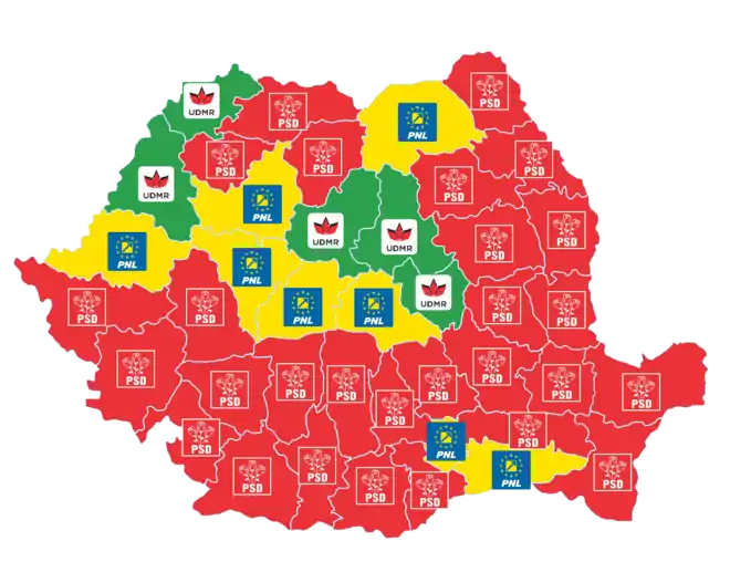 Présidents des conseils de județ par parti en 2016.