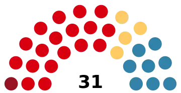 Le nombre de conseillers municipaux est établi en fonction de la population de la commune[2]. Les communes de plus de 100 001 habitants comptent 25 conseillers et un conseiller supplémentaire pour 100 000 habitants ou fraction, ainsi qu'un conseiller supplémentaire si le total de conseillers municipaux constitue un nombre pair. Saragosse comptant officiellement 571 855 habitants recensés à la fin de l'année , elle dispose de 31 conseillers municipaux.