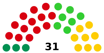 | 31 conseillers municipaux (majorité absolue : 16 conseillers municipaux) | ||||||||||||||
