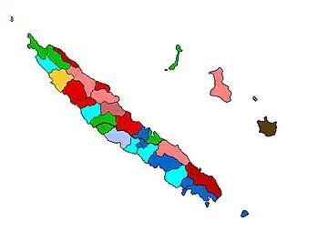 Les règles de scrutin propres aux communes de moins de 3 500 habitants s'appliquent à : Belep, Boulouparis, Farino, Hienghène, l'île des Pins, Kaala-Gomen, Kouaoua, Koumac, La Foa, Moindou, Ouégoa, Ponérihouen, Pouébo, Pouembout, Poum, Poya, Sarraméa, Thio, Touho, Voh et Yaté.