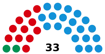 | 33 conseillers municipaux (majorité absolue : 17 conseillers municipaux) | ||||||||||||||
