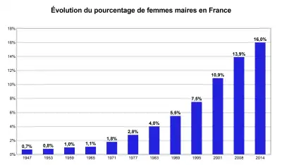 La place des femmes dans les élections municipales françaises demeure, à l'instar de celle qu'elles occupent dans la vie politique française en général, nettement minoritaire. Si d'indéniables progrès ont été réalisés depuis 1947 (date du premier scrutin municipal auquel les femmes sont électrices et éligibles[66]), la marche vers la parité se révèlent extrêmement lente. Ainsi, après une longue période de stagnation de 1947 à 1965, la féminisation des conseils municipaux ne commence à s'opérer que timidement à partir du début des années 1970. Il faut attendre les années 2000 pour que des mesures législatives ne viennent imposer la parité. Toutefois, si la part des femmes dans les conseils municipaux atteint 40,3 % en 2014, seuls 16 % des maires sont des femmes à cette date.