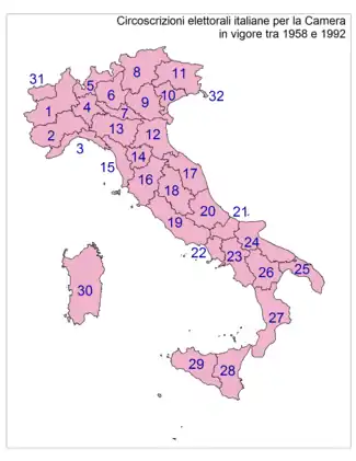Le territoire italien est divisé en 32 circonscriptions, 31 plurinominales — qui comprennent toutes au moins deux provinces, sauf celles de Campobasso et Trieste — et la Vallée d'Aoste, qui n'élit qu'un représentant selon le scrutin uninominal majoritaire à un tour. Il n'y a pas de seuil électoral.