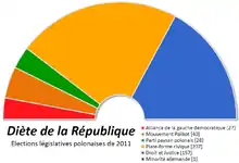 La Diète (en polonais : Sejm) et le Sénat (en polonais : Senat) sont les deux chambres du Parlement de la République de Pologne qui constituent l'Assemblée nationale. La première, chambre basse, se compose de 460 membres, élus au scrutin proportionnel plurinominal. Un parti pour pouvoir siéger à la Diète doit obtenir au moins 5 % des voix, seuil qui est relevé à 8 % lorsqu'il s'agit d'une coalition. La minorité allemande est quant à elle exemptée de cette règle. La seconde, chambre haute, a 100 membres qui sont tous élus au scrutin uninominal majoritaire à un tour au sein d'une circonscription.