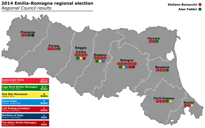 | Stefano Bonaccini | 615 723 | 49,05 | 1 | Parti démocrate (PD) | 535 109 | 44,53 | 29 | |||||||