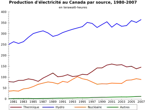 Le Canada occupe le troisième rang mondial dans le domaine de la production d'hydroélectricité[2], qui constituait 60 % de toute l'électricité produite au Canada en 2020[3]. Depuis 1960, d'importants aménagements hydroélectriques, en particulier au Québec, en Colombie-Britannique, au Manitoba et à Terre-Neuve-et-Labrador, ont accru de manière significative la puissance installée. En Ontario, des réacteurs nucléaires CANDU, de conception canadienne, ont fourni plus de la moitié de la demande provinciale en 2007.