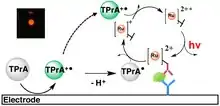 Différents chemins mécanistiques permettent l’émission d’ECL. Même si le mécanisme d’annihilation est le premier qui a été décrit, l’utilisation d’un co-réactif est bien plus utilisée dans la littérature. L’idée centrale est d’oxyder simultanément le luminophore et le co-réactif à la surface de l’électrode. Après une étape de dissociation chimique, le produit d’oxydation du co-réactif est transformé en radical très réducteur qui réagit avec le produit d’oxydation du luminophore pour générer l’état excité. De façon analogue, un mécanisme comparable peut être mis en œuvre par réduction plutôt qu’oxydation. Néanmoins, des études récentes ont montré qu’il existe en réalité de nombreux chemins mécanistiques qui sont en compétition et permettent d’expliquer les résultats expérimentaux, notamment l’extrême sensibilité de cette méthode de mesure[8],[9],[10].