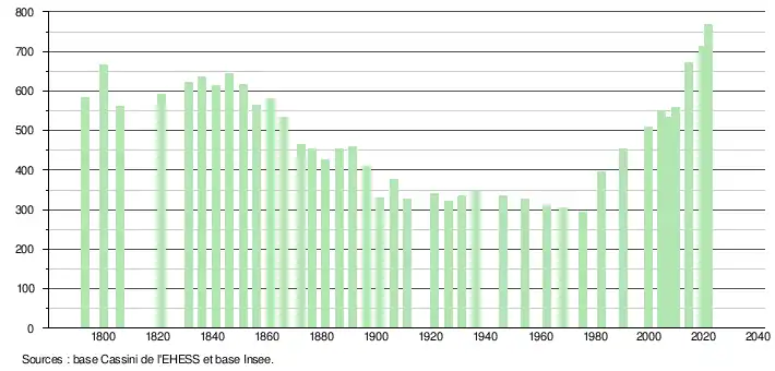 L'évolution du nombre d'habitants est connue à travers les recensements de la population effectués dans la commune depuis 1793. Pour les communes de moins de 10 000 habitants, une enquête de recensement portant sur toute la population est réalisée tous les cinq ans, les populations légales des années intermédiaires étant quant à elles estimées par interpolation ou extrapolation[19]. Pour la commune, le premier recensement exhaustif entrant dans le cadre du nouveau dispositif a été réalisé en 2004[20].