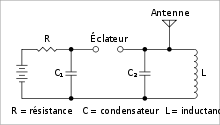 Dans le circuit de principe simplifié représenté à droite, le condensateur C1 est chargé à travers la pré-résistance R pour limiter le courant à haute tension de quelques kV à 100 kV. Le processus de charge se termine par l'allumage de l'éclateur, il y a une décharge d'étincelles dans le circuit oscillant parallèle composé de C2 et d'une bobine L. Le circuit oscillant, équilibré à une fréquence de résonance déterminée par les valeurs de C2 et L, transmet une partie de l'énergie à l'antenne sous forme d'oscillation amortie. Lors de la décharge, il se produit une forte détonation comme celle de la foudre, d'où le nom de ce type d'émetteur.