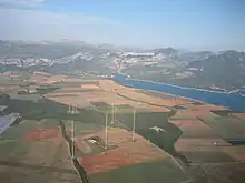 Vue aérienne du centre émetteur. Les trois pylônes alignés constituent l'antenne principale qui rayonne vers Brest, le pylône de secours, plus isolé, rayonne de manière omnidirectionnelle. À l'arrière plan, les cinq pylônes diffusant les programmes religieux de la TWR dans cinq directions possibles.