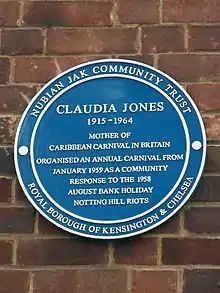 Le Carnaval de Notting Hill a été créé par Claudia Jones en 1959 en réponse aux émeutes et aux autres incidents raciaux ayant touché le pays au cours de l'année.