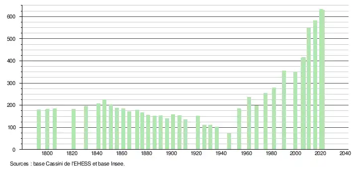 L'évolution du nombre d'habitants est connue à travers les recensements de la population effectués dans la commune depuis 1793. Pour les communes de moins de 10 000 habitants, une enquête de recensement portant sur toute la population est réalisée tous les cinq ans, les populations légales des années intermédiaires étant quant à elles estimées par interpolation ou extrapolation[20]. Pour la commune, le premier recensement exhaustif entrant dans le cadre du nouveau dispositif a été réalisé en 2005[21].