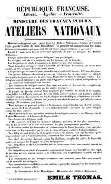 Le , le gouvernement provisoire instaure les Ateliers nationaux afin de venir en aide aux ouvriers sans travail. Plus proche des ateliers de charité de l'Ancien régime que des théories nouvelles d'organisation du travail, cette institution est surtout considérée par la fraction modérée du gouvernement comme un moyen de contrecarrer auprès des ouvriers l'influence du socialiste Louis Blanc et de sa Commission du Luxembourg.