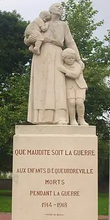 Après la loi de 1919, pour inciter les communes à commémorer les morts au combat de la première guerre mondiale, Hippolyte Mars, maire d'Équeurdreville souhaite ériger un monument aux morts pacifiste. En 1922, le projet d'un sculpteur parisien est rejeté. Rachel Hautot propose alors deux projets : un soldat brisant son arme ou un père et une mère pleurant leur fils. La commission aux beaux-arts et le comité du monument aux morts sont d'accord. Des dissensions se font jour au conseil municipal. Le projet est retardé puis enterré. Finalement, Émilie Rolez soumet son projet. Il s'agit d'un groupe rapproché d'une veuve en pleurs avec ses deux enfants[4]. Le monument porte l'inscription « Que maudite soit la guerre »[5]. Le projet est retenu. Le monument est inauguré le 18 septembre 1932[6].