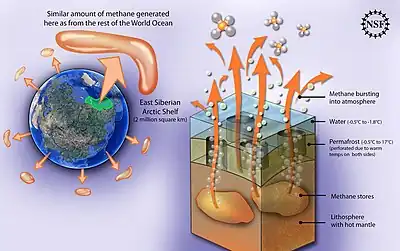 La quantité qui s'échappe de cette zone est comparable à tout le méthane provenant du reste des océans du monde réunis. Le méthane est un gaz à effet de serre 30 fois plus puissant que le dioxyde de carbone. Enfin, en fondant le permafrost libère aussi de l'oxyde nitreux qui est aussi un gaz à effet de serre[23],[24].