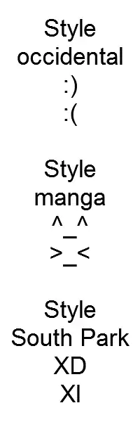 Ces émoticônes ont généralement un format semblable à (*_*). Les astérisques indiquent les yeux ; le caractère central, un trait de soulignement en règle générale, la bouche ; et les parenthèses, le contour du visage.