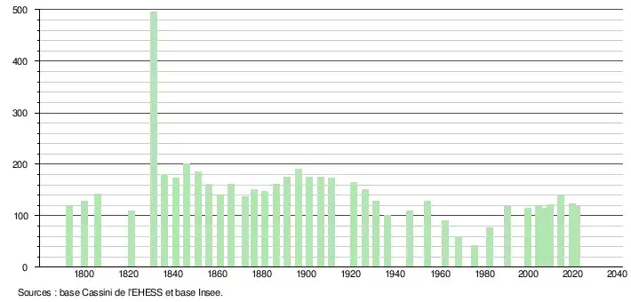 L'évolution du nombre d'habitants est connue à travers les recensements de la population effectués dans la commune depuis 1793. Pour les communes de moins de 10 000 habitants, une enquête de recensement portant sur toute la population est réalisée tous les cinq ans, les populations légales des années intermédiaires étant quant à elles estimées par interpolation ou extrapolation[22]. Pour la commune, le premier recensement exhaustif entrant dans le cadre du nouveau dispositif a été réalisé en 2004[23].
